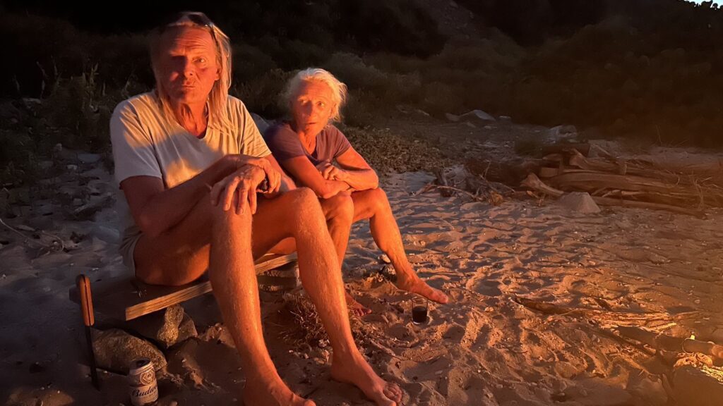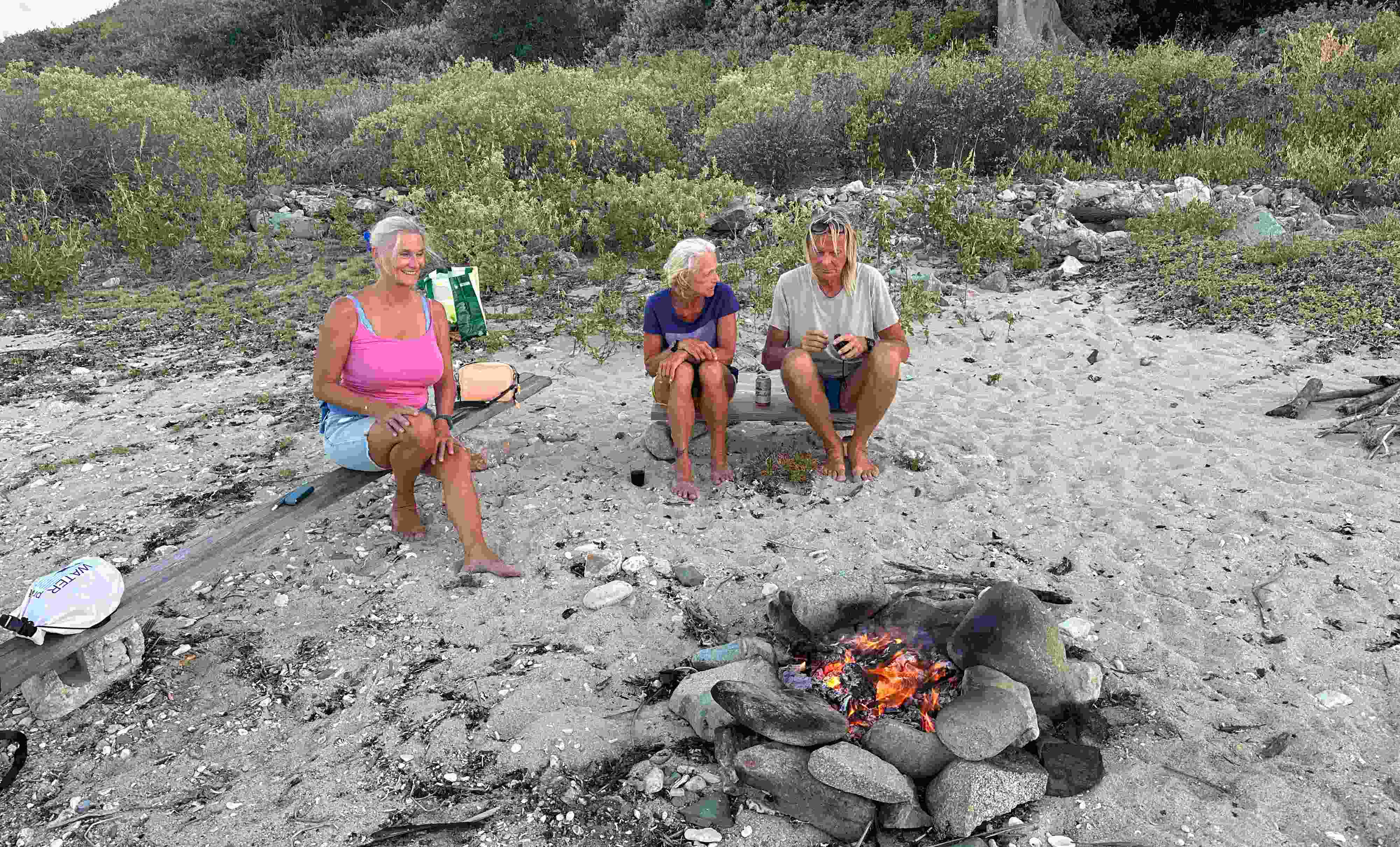 Ein paar Häuserruinen, der vom Hurrikan Irma zerlegte Steg und die alte Salzlache sind die letzten Überbleibsel der heisigen Zivilisation. Dazu ein leerer Sandstrand. Also ein idealer Platz für ein Sunset Lagerfeuer. Mit schlechtem Gewissen 😜 fuhren wir mit dem Beiboot an den Strand, zogen es aus dem Wasser und genossen das bereits lodernde Feuer, dass die beiden Freunde vorbereitet hatten. Kudi hat mit zwei Holzplatten auf großen Steinen zwei Sitzbänke herbeigezaubert. Andi hatte trockenes Holz gesammelt und wir? Wir hatten ein schlechtes Gewissen, nicht mitgeholfen zu haben. Trotz allem genossen wir das Feuer und den herrlichen Sonnenuntergang.