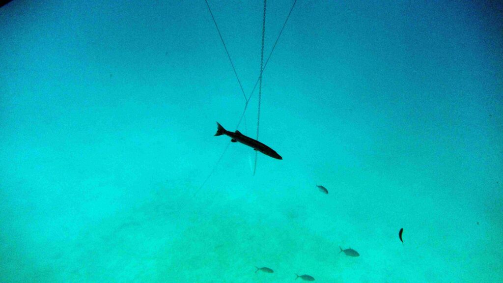 Der kleinere Bruder des oben gezeigten Barracudas, der beim Wrack herumschwomm, lag genau im Schatten von SYMI und schaute mich böse an, als ich unter den Rumpf tauchte. Da es immer wieder zu Unfällen mit diesen Fischen ommt, stieg ich aus dem Wasser, ließ den Rumpf veralgt und trank einen Kaffee…man weiss nie !