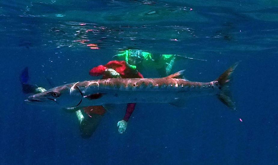 Man kann hier sowohl als Schnorchler als auch mit Flaschen tauchen, da das Wrack an einem Hang liegt. Für uns war es sehr beeindruckend so nahe dran zu sein, um es zu inspizieren. Den Barracuda (siehe Foto) sahen wir dann seelenruhig zwischen den Schnorchlern herumstreunen.