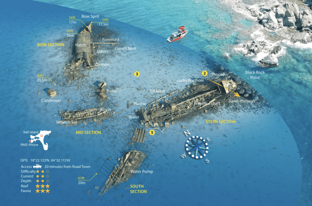 In einer Tiefe zwischen 9 und 26 m liegt hier das Wrack des Segel-Dampfschiffs „RMS-Rhone“, die als Passagier und Postschiff zwischen Southampton und Brasilien und später auch den British Virgin Islands verkehrte.