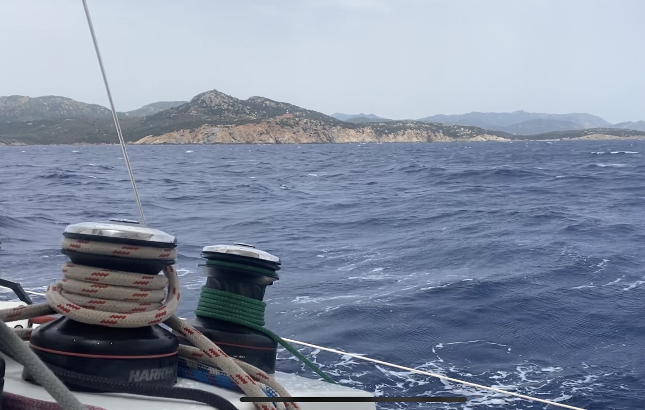 Ein Tiefdruckgebiet über N-Afrika etablierte sich gestern und das Navi-Programm führte uns vorsichtig am Ostrand entlang bis Ziel. Die letzten acht Stunden hatten wir guten Wind, von schräg achtern (hinten), ein idealer Kurs. nach 190 sm und 28 Stunden erreichten wir heute die NW-Ecke von Sardinien und ankerten in einer Bucht. Im Programm war die Länge mit 188,7 sm angegeben. Eine tolle Sache:
