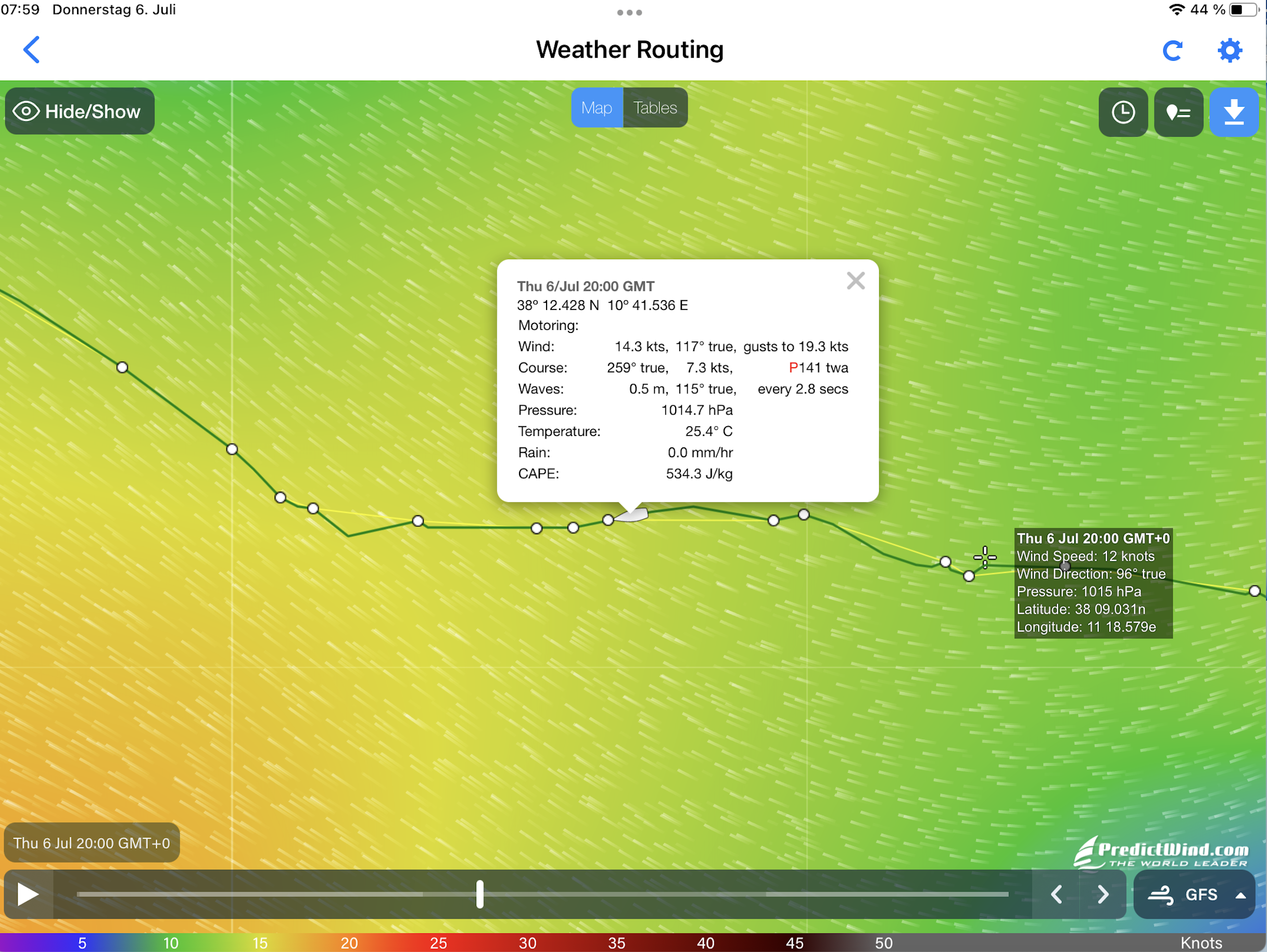 Wir folgten gestern also möglichst genau dieser Strecke, wobei der Anfang eher windarm war und wie angegeben mit Motorbenutzung zu fahren war. Das Navi-Programm führte uns durch möglichst günstige Windzonen, die entlang der Route lagen, um Diesel zu sparen und die Segel nutzen zu können.
