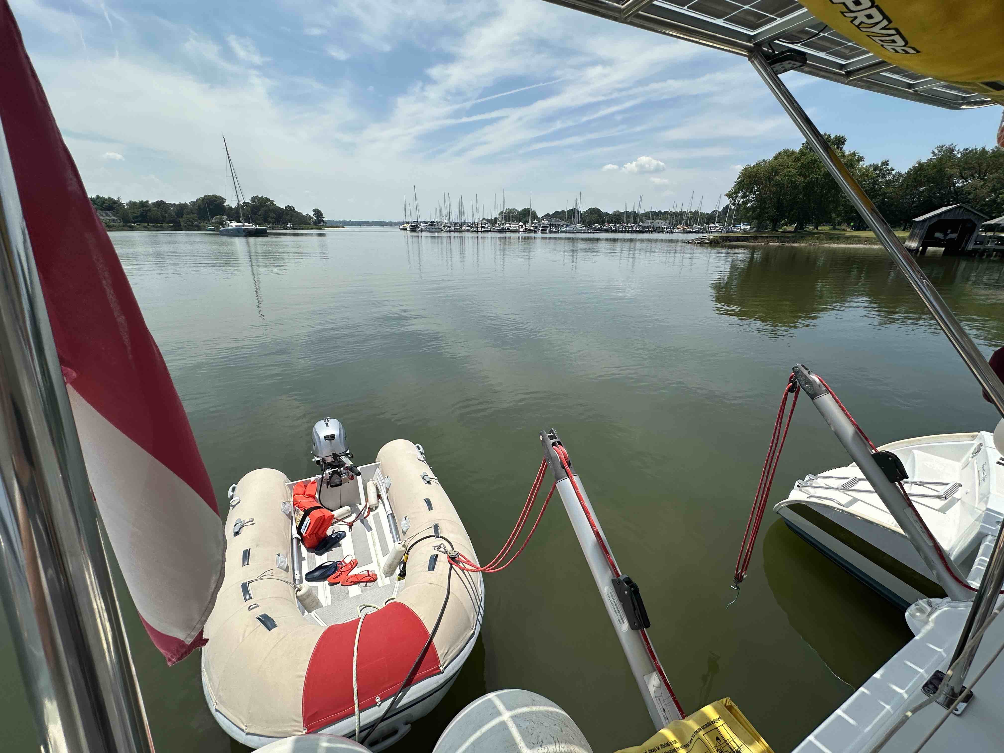 Die teilweise fünf Zentimeter dicken Muschelbänke, die an Symis Rumpf angewachsen waren, werde ich erst am Trockenen entfernen können. Einen solch langen Bart hatte das Boot noch nie. Schande und außerdem bremst es die Fahrt um fast 1 Knoten. Eine Außenreinigung, wie wir sie sonst mit Taucherbrille machten, konnten wir seit Palm Beach zunächst wegen der Haie, später Alligatoren und Schlangen, hier in der Chesapeake wegen der lästigen, nesselnden Quallen nicht mehr durchführen. Jetzt haben wir das Wochenende vor uns und hoffen auf einen baldigen Krantermin.