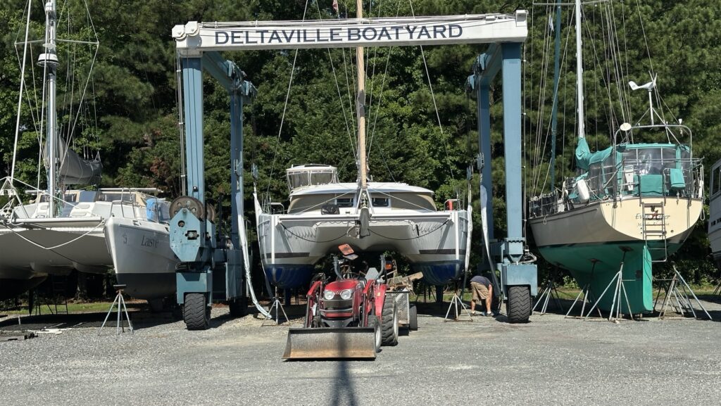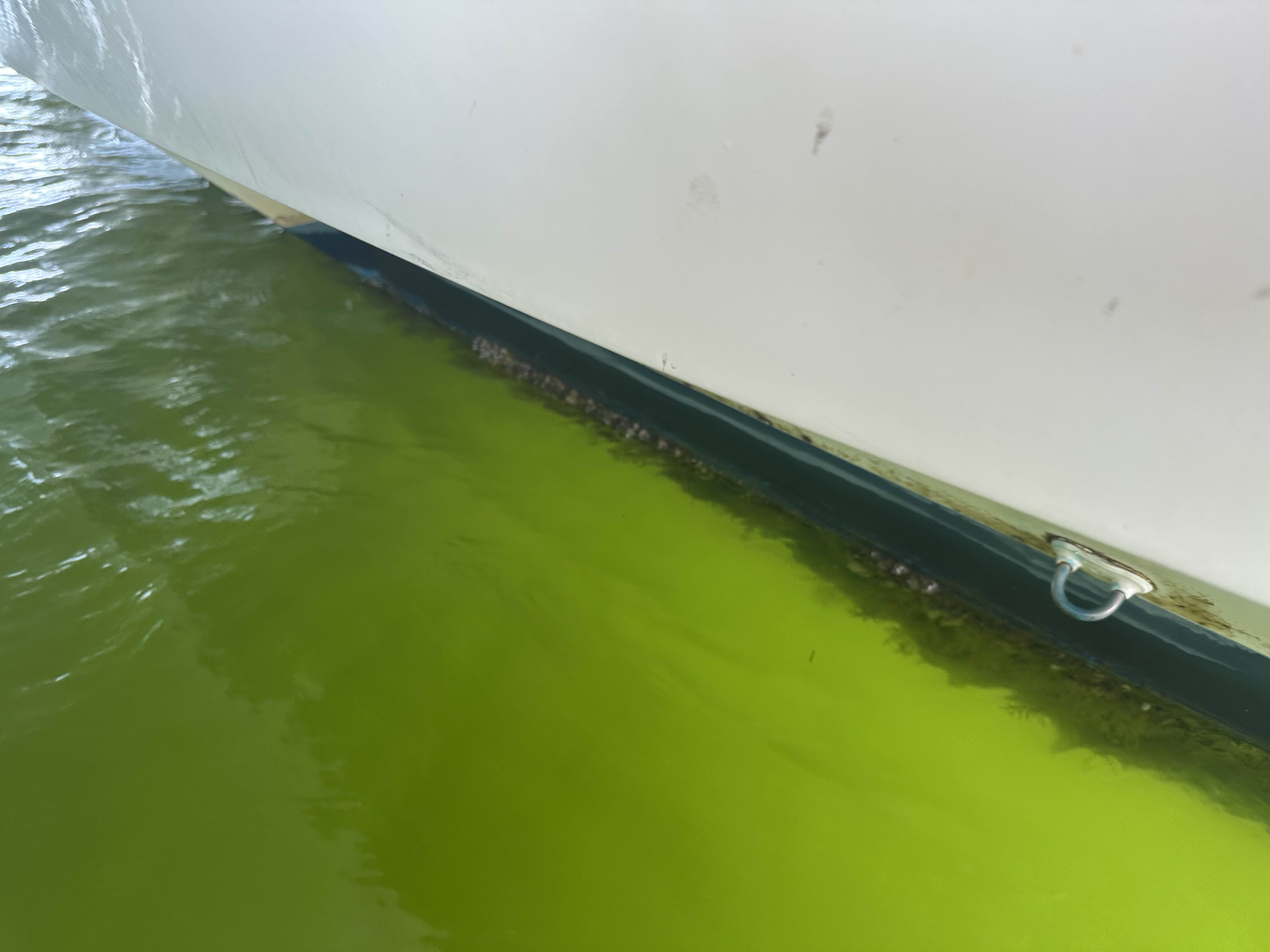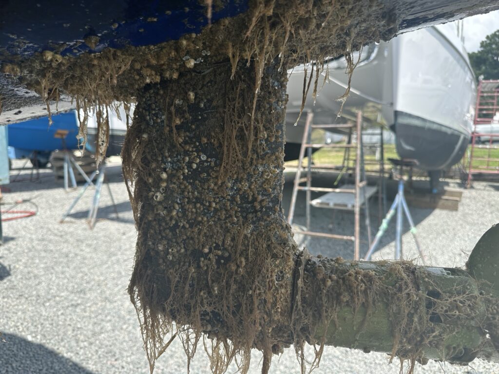 Mehr als eine Woche hatten wir in der kleinen Bucht von Deltaville vor Anker vor unserem Boatyard gewartet. Hatten Reinigungsarbeiten begonnen, um die Zeit tot zu schlagen. Dann endlich mit zwei Tagen Verspätung wurde SYMI aus ihrem Element herausgekrant und gewaschen. Was sich an ihrem Rumpf zeigte, war das Ergebnis zweier Monate in nährstoffreichen Gewässern. Die kleinen vulkanartigen Muscheln (engl. Barnacles genannt) setzten sich haufenweise am Rumpf fest. Der Metallschaber hatte es schwer, sie abzukratzen. So einen Bewuchs hatte ich noch nie zuvor.