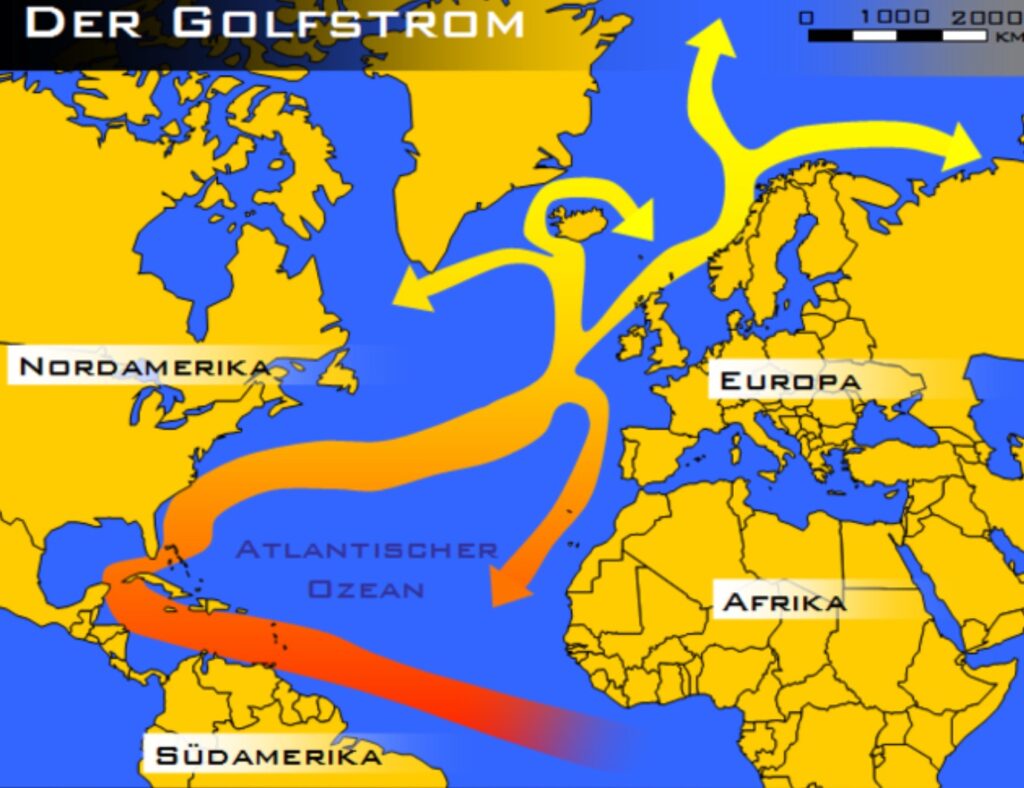 Delfine und Schildkröten schwimmen dazwischen und auf den Fahrkanal Betonnungszeichen sitzen Fregattvögel, Seeadler oder Pelikane.